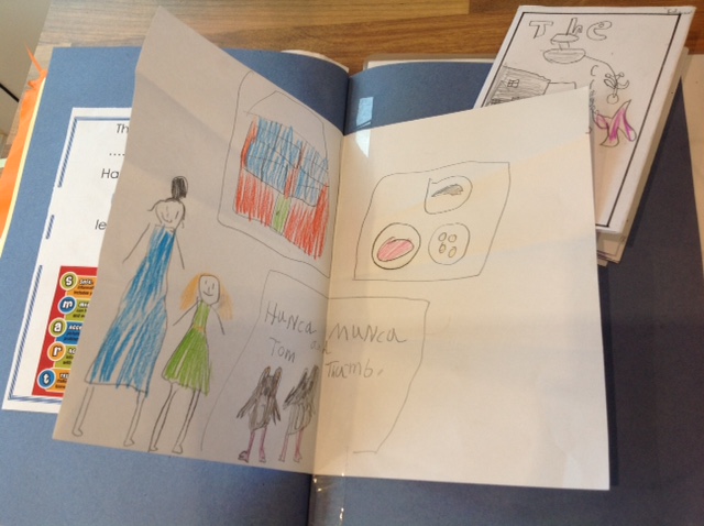 I simply stick in each item with some glue or cellotape and use biro or felt tip to briefly write the date, child and possibly a short explanation (if I have time).
