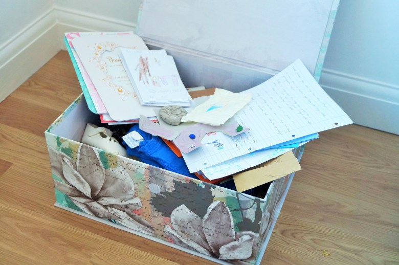 It contains treasures from my children such as letters, cards and creations such as a clay ammonite made for me by one child and a special letter from the other.
